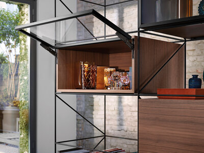 Pohištvo – omara, vitrina ali predal – mora biti v središču pozornosti. Nihče ne želi videti izpopolnjene tehnologije z nastavitvijo zbiralnika moči s sprednje strani, vgrajenega omejevalnika odpiranja in brezstopenjsko zaustavitvijo zadaj. Celo pri dvižni stranici s prozornim steklom, ni mogoče videti okovja v zaprtem stanju. Pri odpiranju se prikažejo ročice Aventos HKi v plemeniti onyx črni barvi.