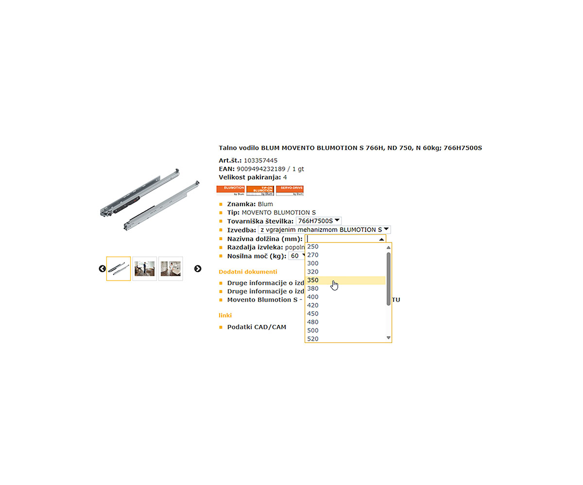 Gotovo poznate situacijo. Imate že izbrana prava notranja vrata ali vijak za vaš projekt, le da navedena širina ali premer ne ustrezata. Pri tem vam lahko zdaj priskočimo na pomoč z dodatno možnostjo izbire. Ko se v strukturni skupini nahaja več kot eden izdelek in se izdelki razlikujejo v več kot eni lastnosti, se bodo različne lastnosti prikazale v spustnem meniju in jih boste tako izbrali. Prikazane bodo vse lastnosti izdelka, ne le tiste v opisu, zato se, ko izdelku dodamo filtre, se vrednosti, ki se ne ujemajo izločijo.