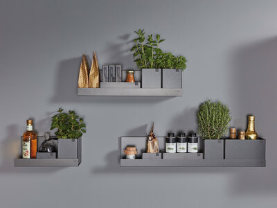 Za red na polici poskrbita popolnoma usklajena škatla VS ADD® in delilnik VS ADD®. Zaradi prašno lakirane jeklene pločevine in minimalistične oblike so trije organizacijski elementi prava sanjska kombinacija. Polica z različno velikimi škatlami je na voljo v beli, srebrni, lava barvi, v barvi aluminija, barvi kamna (Stone) in barvi Nero (črna) s površinami svileno mat in strukturirana mat. Polica je nevidno pritrjena na steno in se harmonično zlije z opremo vašega prostora.